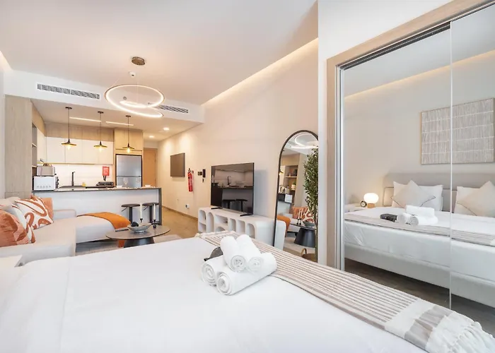 Las habitaciones destacan por su diseño funcional y acogedor. La cama de matrimonio es el lugar ideal para recuperar energías tras un día explorando Dubái. Además, el estudio cuenta con una cocina totalmente equipada, lo que te permite disfrutar de tus comidas favoritas en la comodidad de tu alojamiento. La iluminación natural realza la calidez del espacio, creando un ambiente tranquilizador.